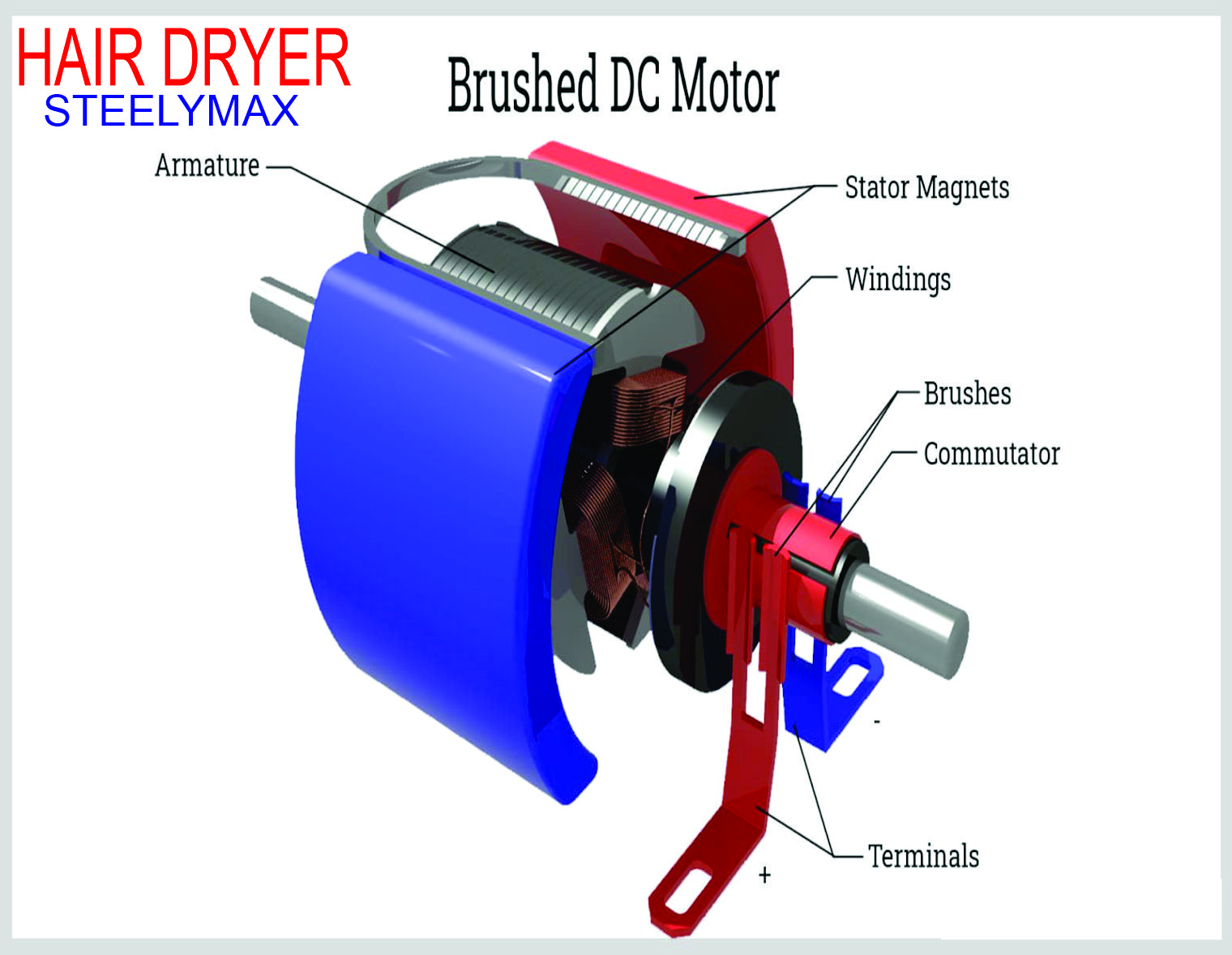 بهطورکلی میتوان موتور AC سشوارها را به ۴ قسمت تقسیم کرد. ۱-هسته ۲- بدنه ۳- زغال ۴- پروانه